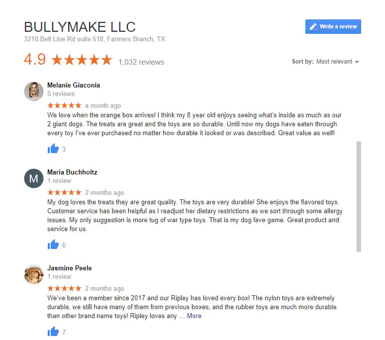 BULLYMAKE has been around since 2014 with a special mission: keep power chewing dogs (and their parents) happy and satisfied. The way BULLYMAKE does this is by designing and manufacturing unique, highly durable toys every month catered specifically to your power chewer, right here in the USA, and shipped right to you.